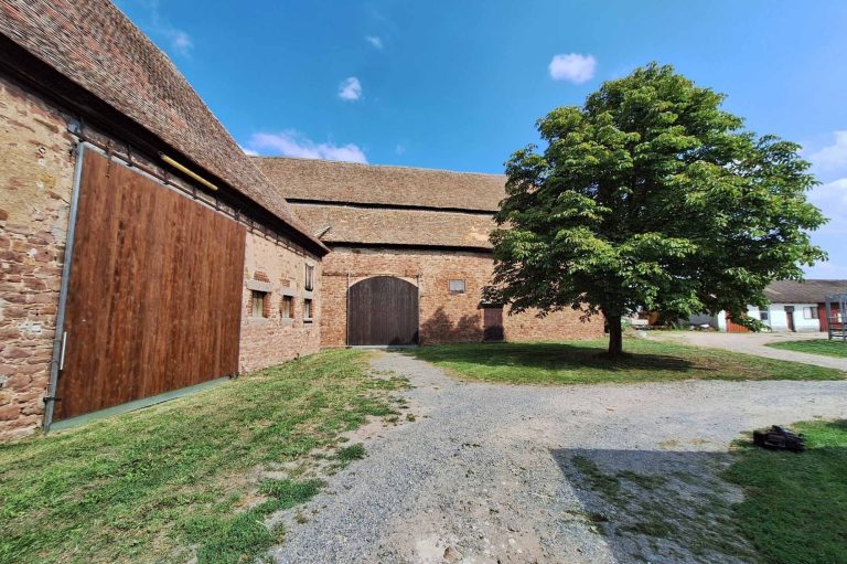 Aktuelle Hofansicht mit Blick auf die Zehntscheune in der Mitte des Bildes und der Doppelscheune links. Auf der Eingangstür der Zehnt- scheune ist eine Hochwassermarke zu sehen, im Sandstein Pfosten der Tür, das Wasser stand am 02. Januar 1833 beinahe einen Meter hoch, im Hof, wie auch im ganzen Ried. Das Thema Wasser und Hochwasser hatte der HGV am 10.08.2024 als Thema.