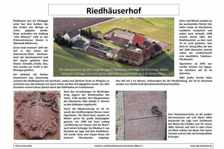 Die Enthüllung der Tafel, symbolisch als Teil des Vortrages, es wurde am Riedhäuser Hof eine Tafel angebracht welche die Geschichte des Hofes in Kürze darstellt. Diesmal wurde die Gedenktafel nicht vor Ort feierlich enthüllt. Ein Besuch vor Ort lohnt sich am Besten mit dem Fahrrad bei schönem Wetter.