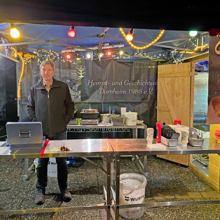Der Vereinsring, zahlreiche Dornheimer und die Vereine haben mit sehr viel Leidenschaft, Kraft und viel Liebe den Weihnachtsmarkt aufgebaut und gestaltet. Vielen Dank an die Gaststätte in der Riedhalle, Lob und Dank dem Wirt. Die Mühe jedes Einzelnen hat sich auf alle Fälle gelohnt, der Weihnachtsmarkt war sehr gut besucht. Angeboten wurde bei uns auf dem HGV-Stand z. B. Gyros mit Tzatziki, Pommes und als süße Spezialität Churros, sowie heißer Orangensaft, Glühwein rot und weiß, wobei der weiße Winzerglühwein sehr gelobt wurde, anbei ein paar Bilder wie es war.